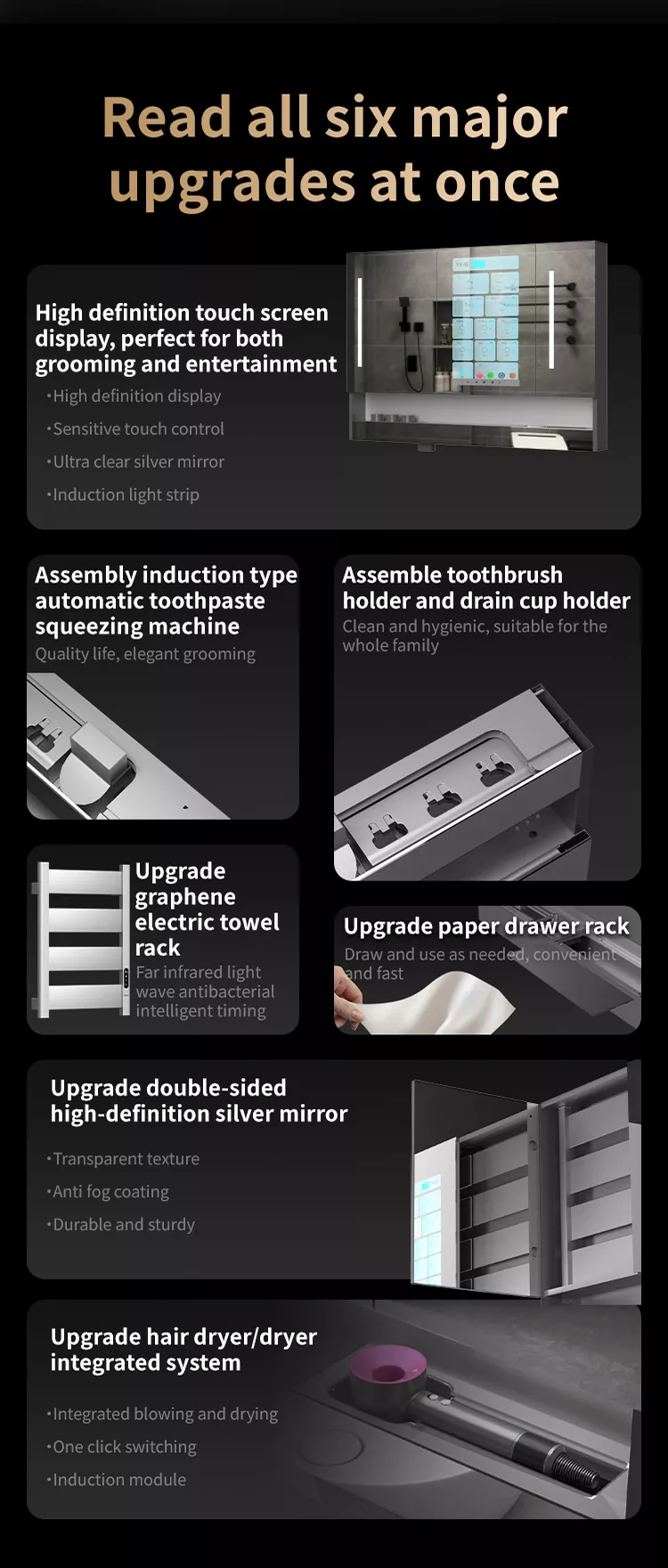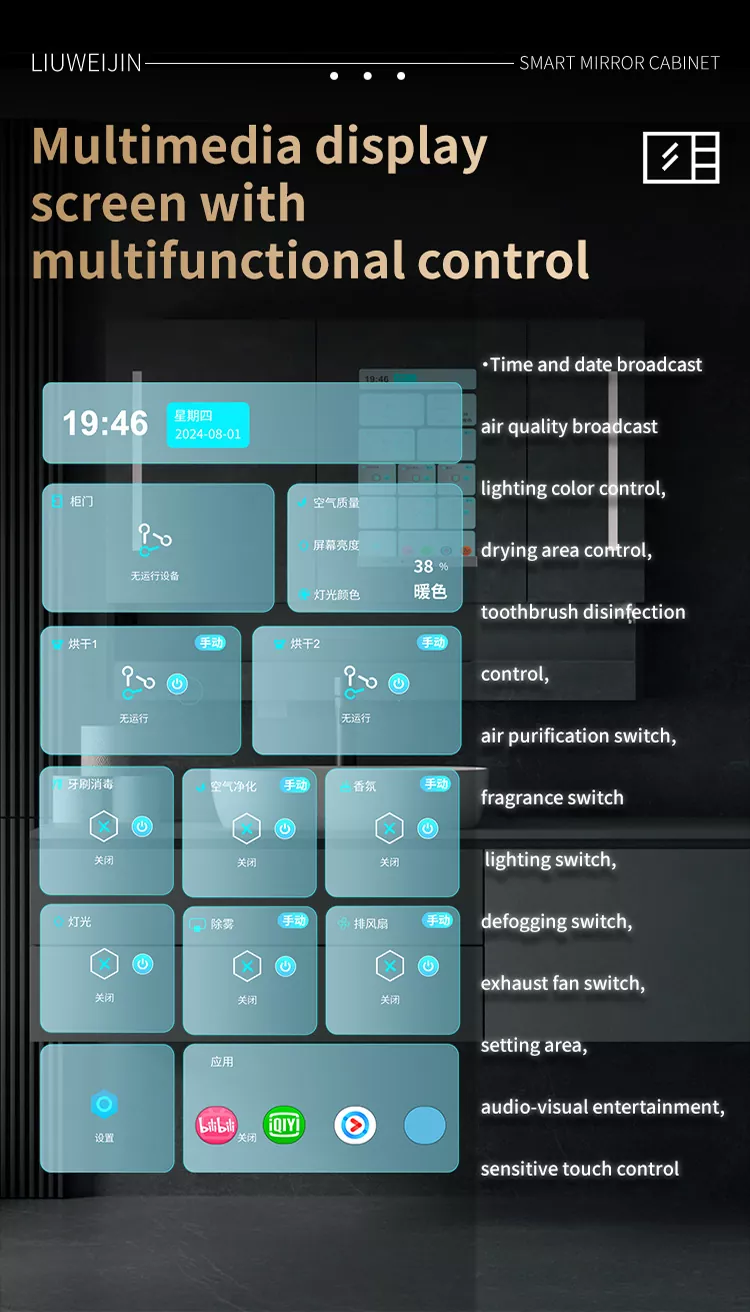 Led lamp strip, automatic toothpaste squeezing machine, tooth cup draining rack, tooth cup toothbrush ultraviolet disinfection device, embedded paper drawing box, hair dryer/dryer dual-purpose conversion device, mirror high-definition display touch screen, mirror defogging system, shaver sterilization, towel rack ion purification, induction hand sanitizer module, integrated control center, graphene heating and drying towel rack, intelligent Systém vůně, systém čištění vzduchu